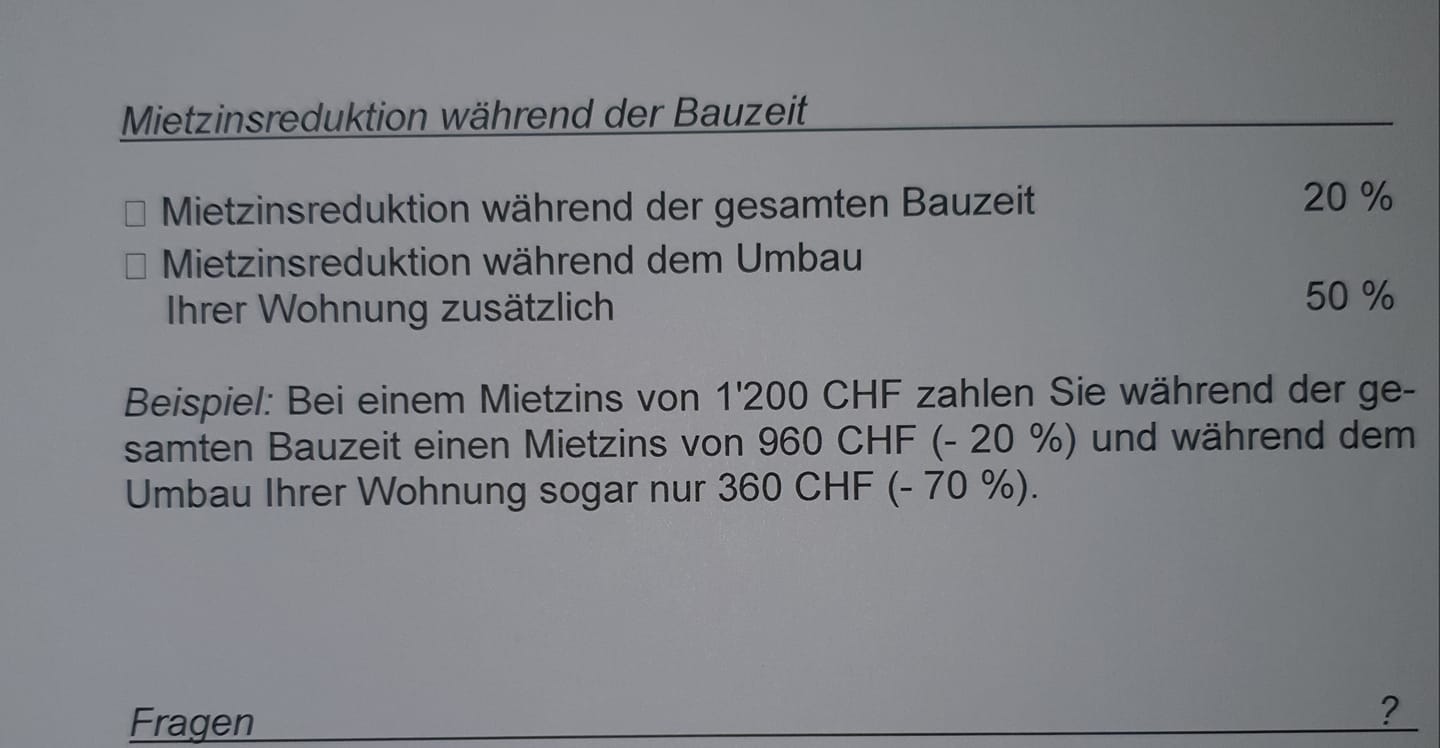 Wir haben schriftlich das beim gesamte Bauzeit 20% Reduktion. Und beim wohnung Umbau 70%.