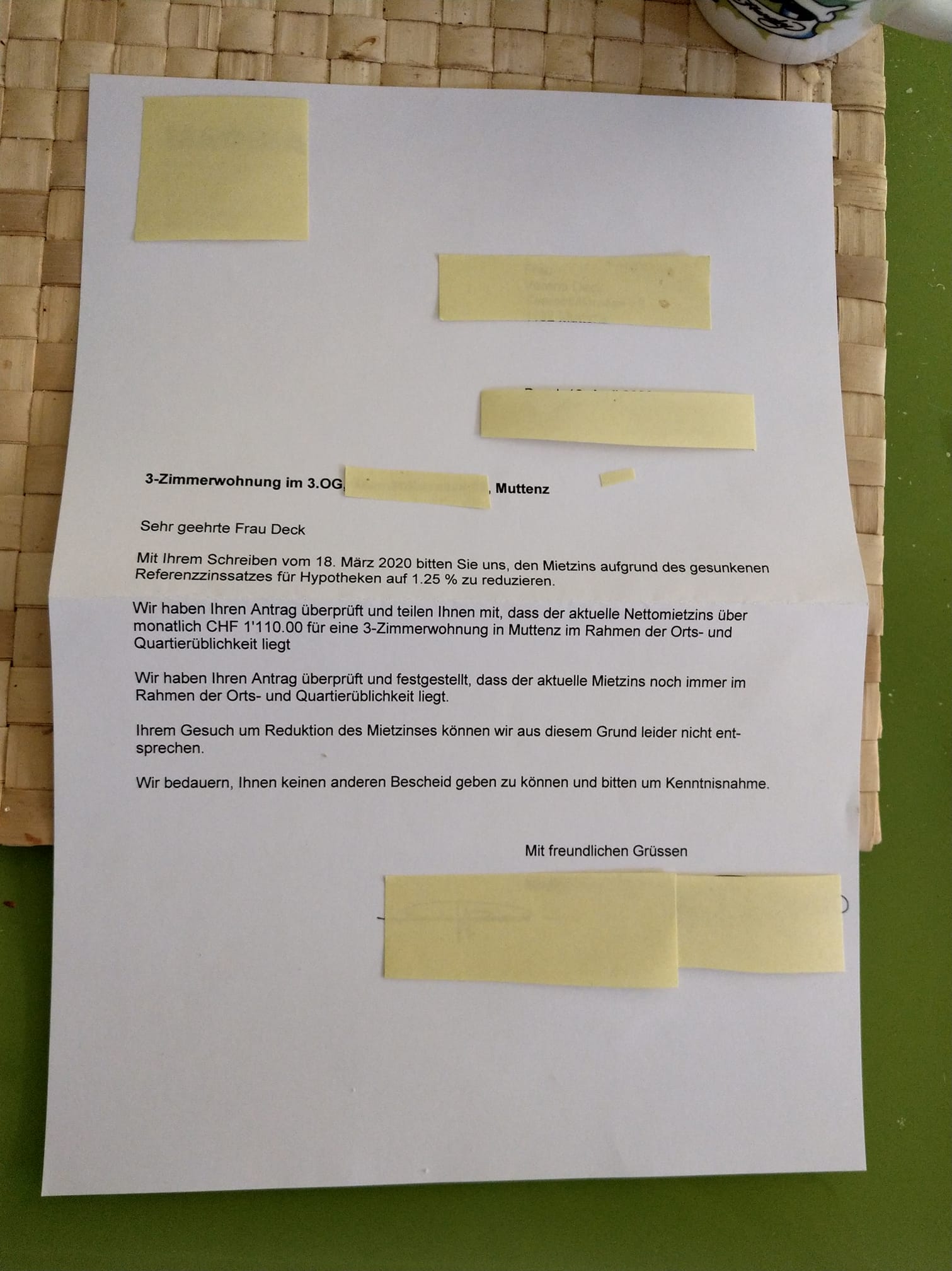 Ich habe eine Frage bezüglich Mietzinsreduktion