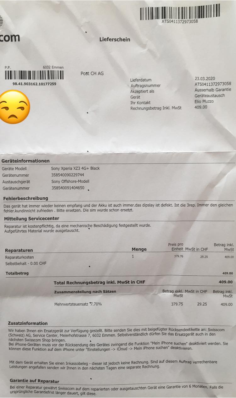Im März 2019 haben wir bei Swisscom ein neues Handy (Sony) gekauft.