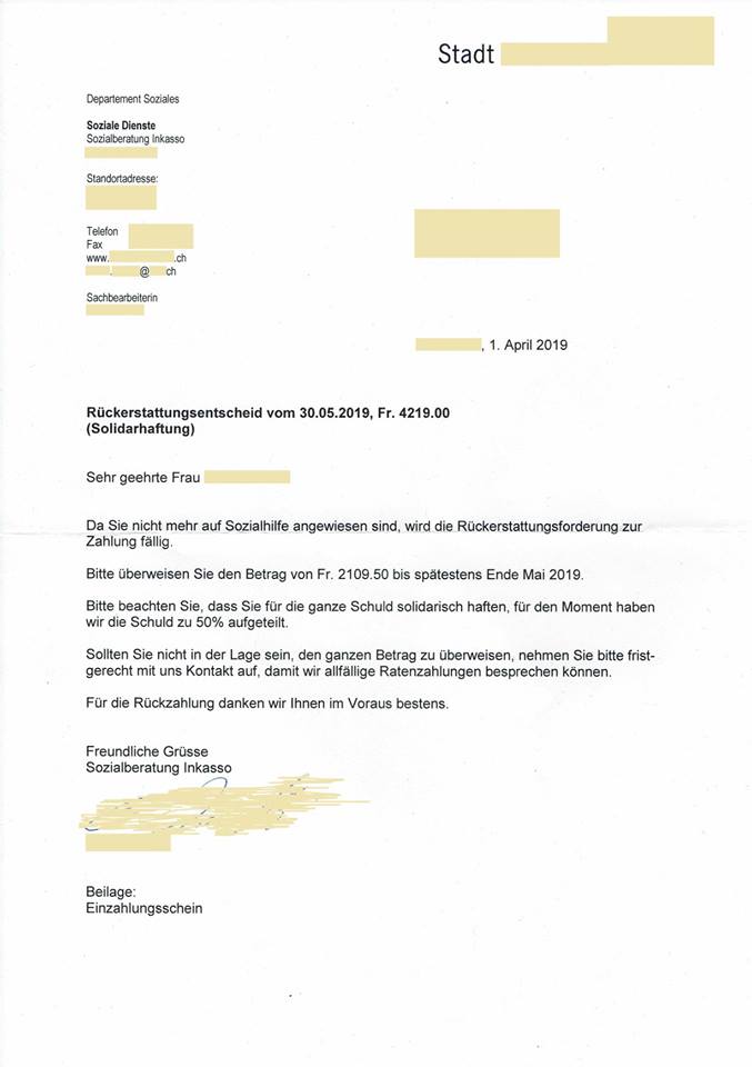 Rechtsfrage: Der Mann hat Sozialhilfebetrug gemacht. Die Ehefrau hat versucht, ihn davon abzubringen und es schliesslich dem Amt gemeldet. Dieses hat sich mit dem Einstellen der Leistungen aber noch einige Monate Zeit gelassen, was den Schaden erhöhte. Daraufhin forderte es den bereits geleisteten Betrag vom Mann zurück. Dieser scheint nicht zu bezahlen, jedenfalls hat die Frau diesen Brief bekommen. Ich riet ihr, zu reklamieren, denn ich bin der Meinung, der Ehepartner hafte nicht für Straftaten, die der andere begeht. Dazu ist noch folgendes zu sagen: das Ehepaar ist inzwischen gerichtlich getrennt. Entgegen der Aussage in dem Brief war die Frau nie sozialhilfeabhängig, lebt aber weit unter dem Existenzminimum. Sie könnte das also schon gar nicht bezahlen, auch wenn sie wollte.