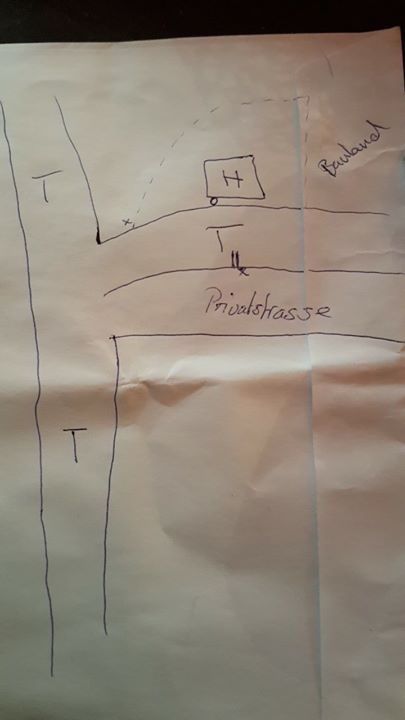 Hallo ihr lieben villeicht kann uns jemand helfen. Der Chef der Postverteilung hat im februar als wir eingezogen sind von uns verlangt eine Treppe ( die beiden striche unten am T)zu machen die von der Privatstrasse auf den Weg ( T) geht bezüglich des briefkasten ( o) dies habeb wir gemacht. So jetzt hat er im November uns einen Brief geschrieben das wir unseren briefkasten entweder an die Privatstrasse versetzen ( markiert mit X ) oder vorne an den Weg ( markiert mit X) da jedoch der weg zu unserem Haus auxh zu dem Weg der gerade Hoch geht gehört steht ja unser Briefkasten wie in den Richtlinien an unserer Grundstpcksgrenze. Hinter unserem Haus ( H) wir im frühling angefangen 2 Häuser zu Bauen. Diese werden ebenfalls durch den Weg (T) der an unserem Haus vobeigeht erreicht. Da es über die Privatstrasse keine Möglichkeit giebt auf die beiden Grunstücke zu gelange weil es Hanglage ist. So jetzt hält der Pöstler unsere Post zurück dh er Stellt sie uns nicht aus. Weil sie 1. Nicht ab dem Roller steigen wollen und die Treppe hoch oder den Weg (T) nach hinten Fahren wollen und halt dan wenden. Wir möchten aber nicht unseren Briefkasten ungeschütz soweit vom Haus entfernt aufstellen. Wer ist im recht? Und weis jemand wer der Vorgesetzte ist von den Chef in unserem Dorf? Ich höffe ihr kommt draus bei der zeichnung.