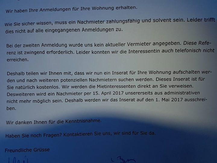 Hallo zusammen.. bin auf der suche nach einem nachmieter. Nun will die verwaltung die leute nicht akzeptieren, da sie angeblich nicht solvent sind. Ich weiss aber, dass von der einen dame das sozialamt die miete übernimmt. Daher wär der mietzins garantiert. Betreibungen hatte sie 3 kleinigkeiten im gesamt betrag von ca 1000.-