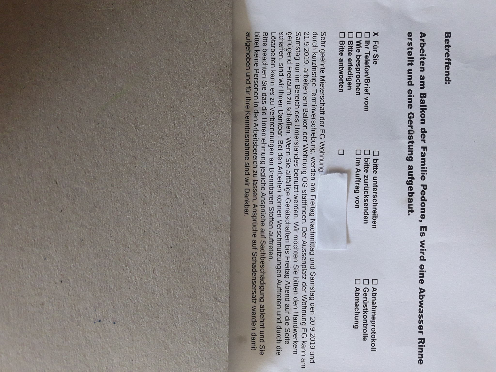 Ich habe da mal eine Frage, der Handwerker hat uns gestern abend zwischen 20:00 und 21:30 diesen Zettel an unsere Türe geklebt. Wir wussten vorher nichts von einem Termin. Nun meine Fragen ist dies so rechtens? Und der letzte Satz ist der so rechtens? Oder kann man bei Beschädigungen trotzdem schadensersatz fordern?