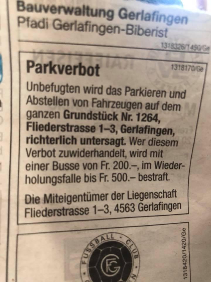isch das rechtens wenn kei richterlichi taflä het?mir händ 2bsuecherparkplätz und de rest isch vermietet.het no blaui zonä.danke viel mols