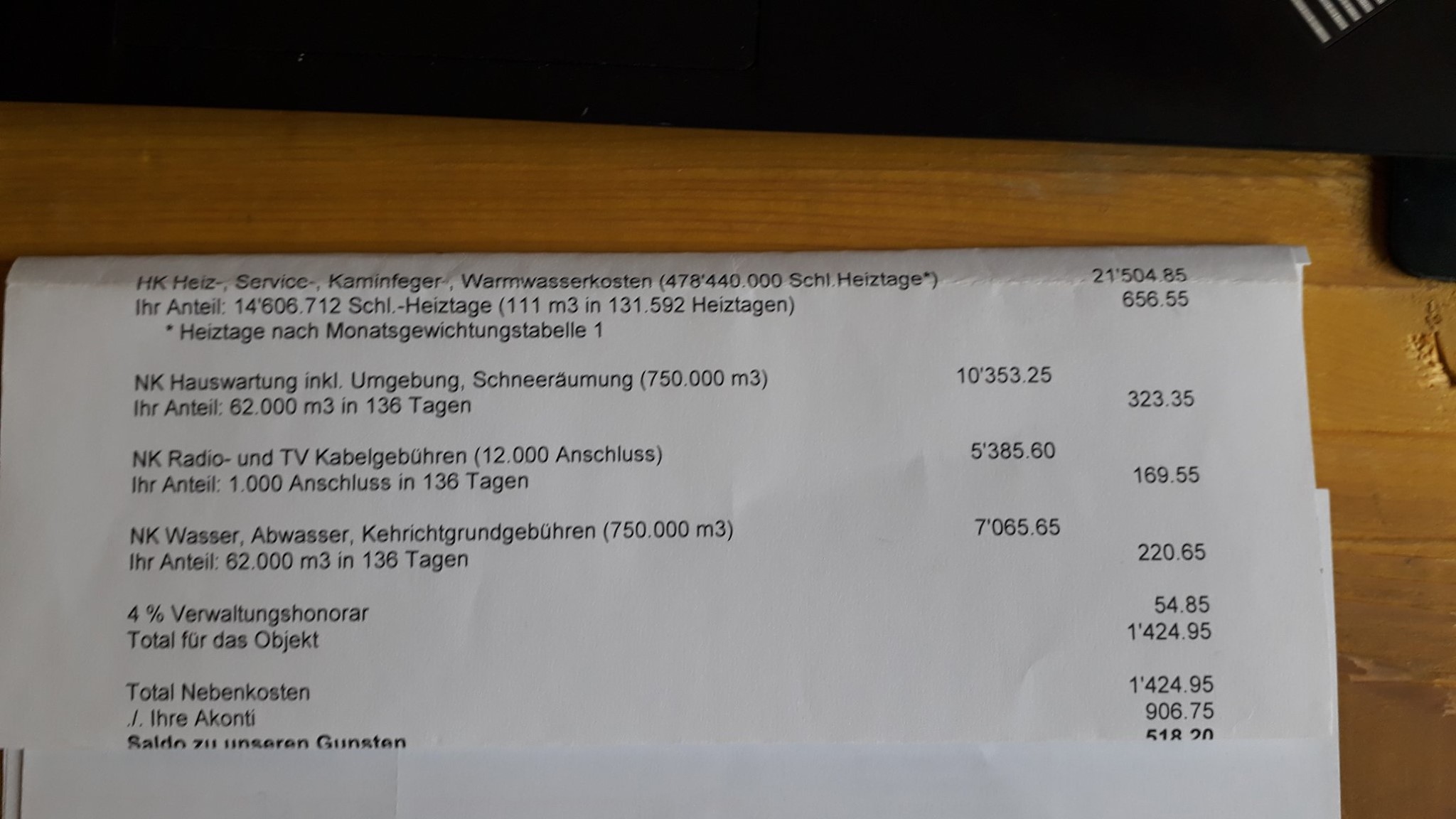 Wir sind vor 1 1/2 Jahren in eine 3-Zimmerwohnung eingezogen. Miete Fr. 900.-- plus Fr. 200.-- Nebenkosten, Total Fr. 1'100.--. Nun haben wir die Nebenkostenabrechnung erhalten und müssten zusätzlich Fr. 1'307.-- (50% mehr als die Akontozahlungen) bezahlen. In den Fotos die Nebenkostenabrechnung von heute, sowie die vom letzten Jahr, wo wir erst ein paar Monate in der Wohnung gewohnt haben).